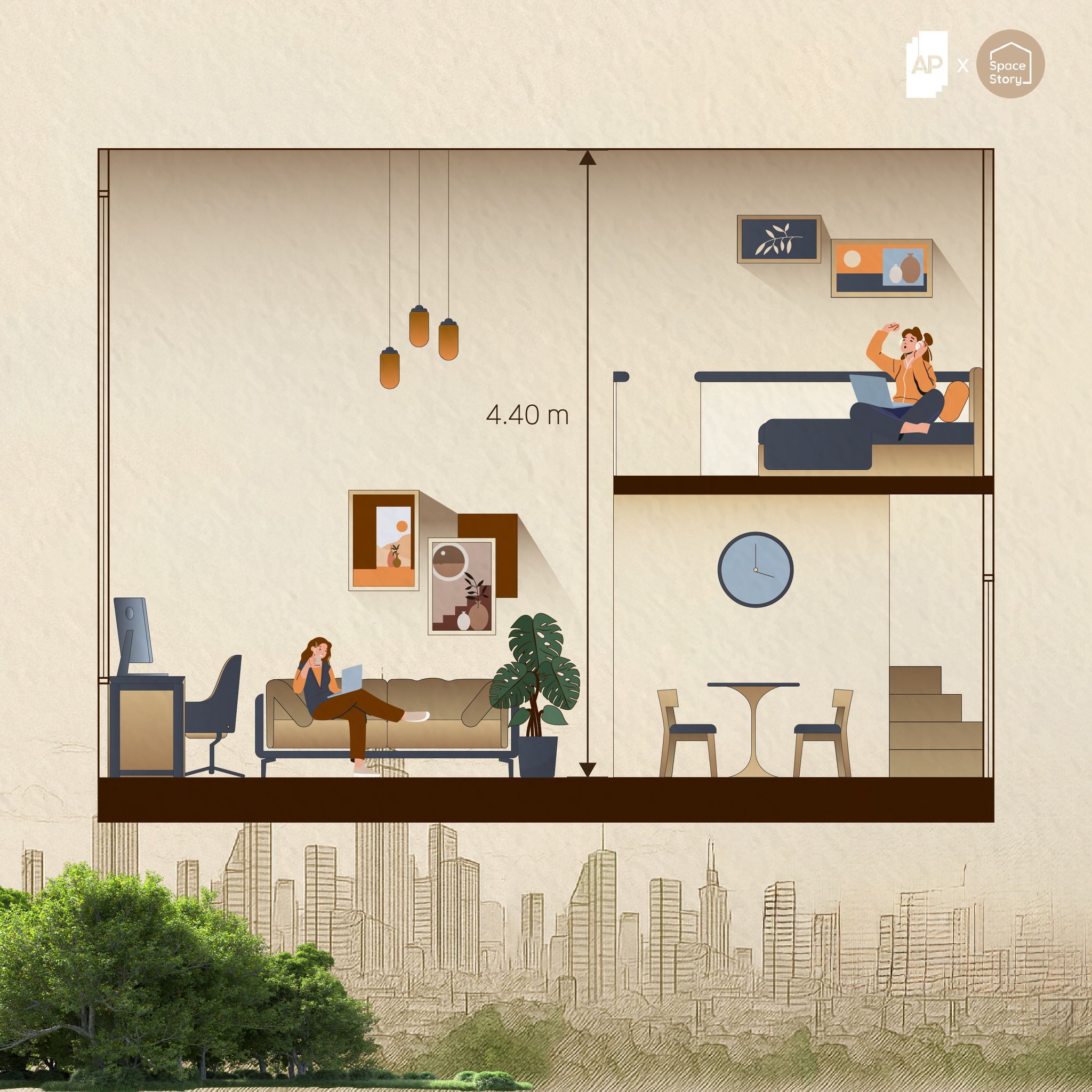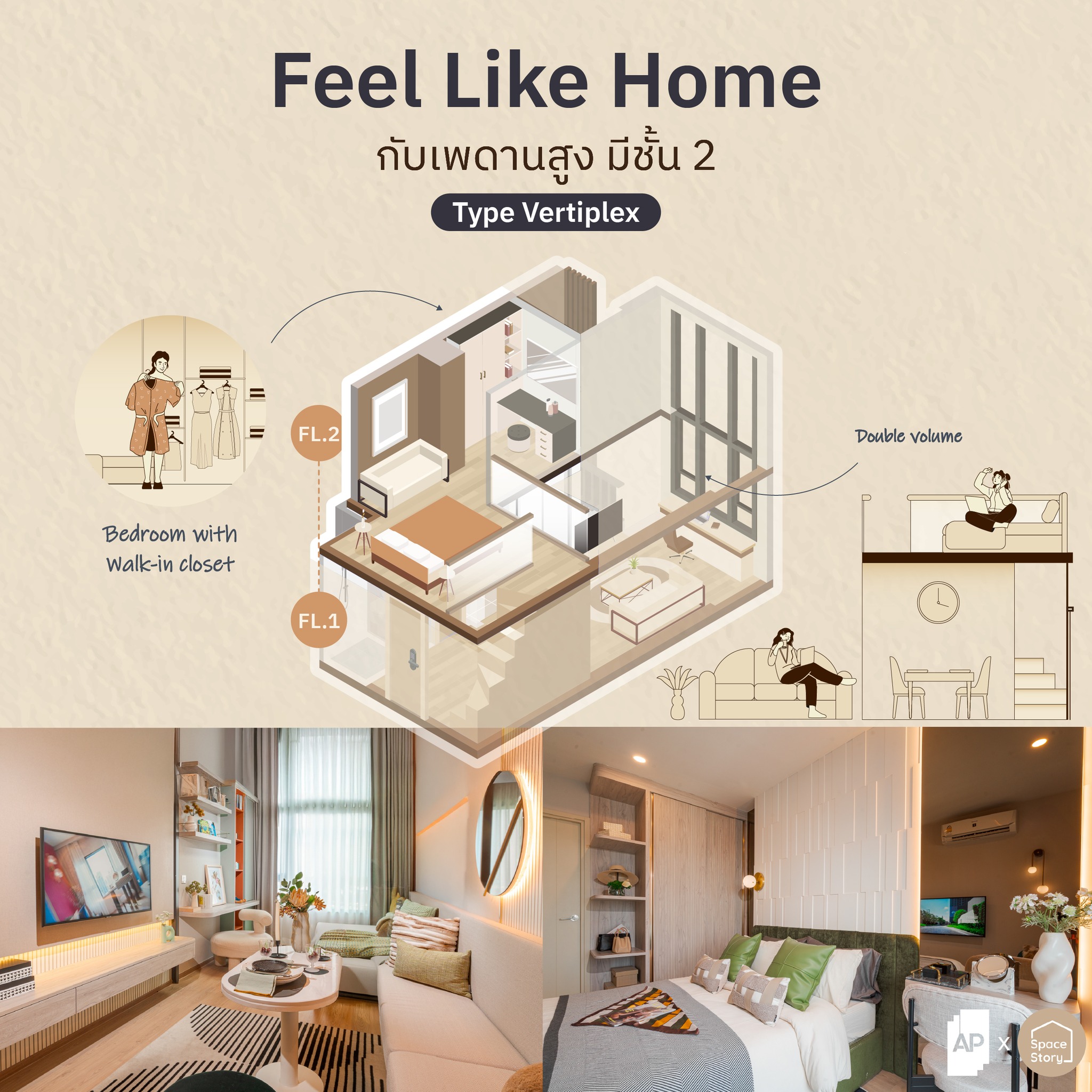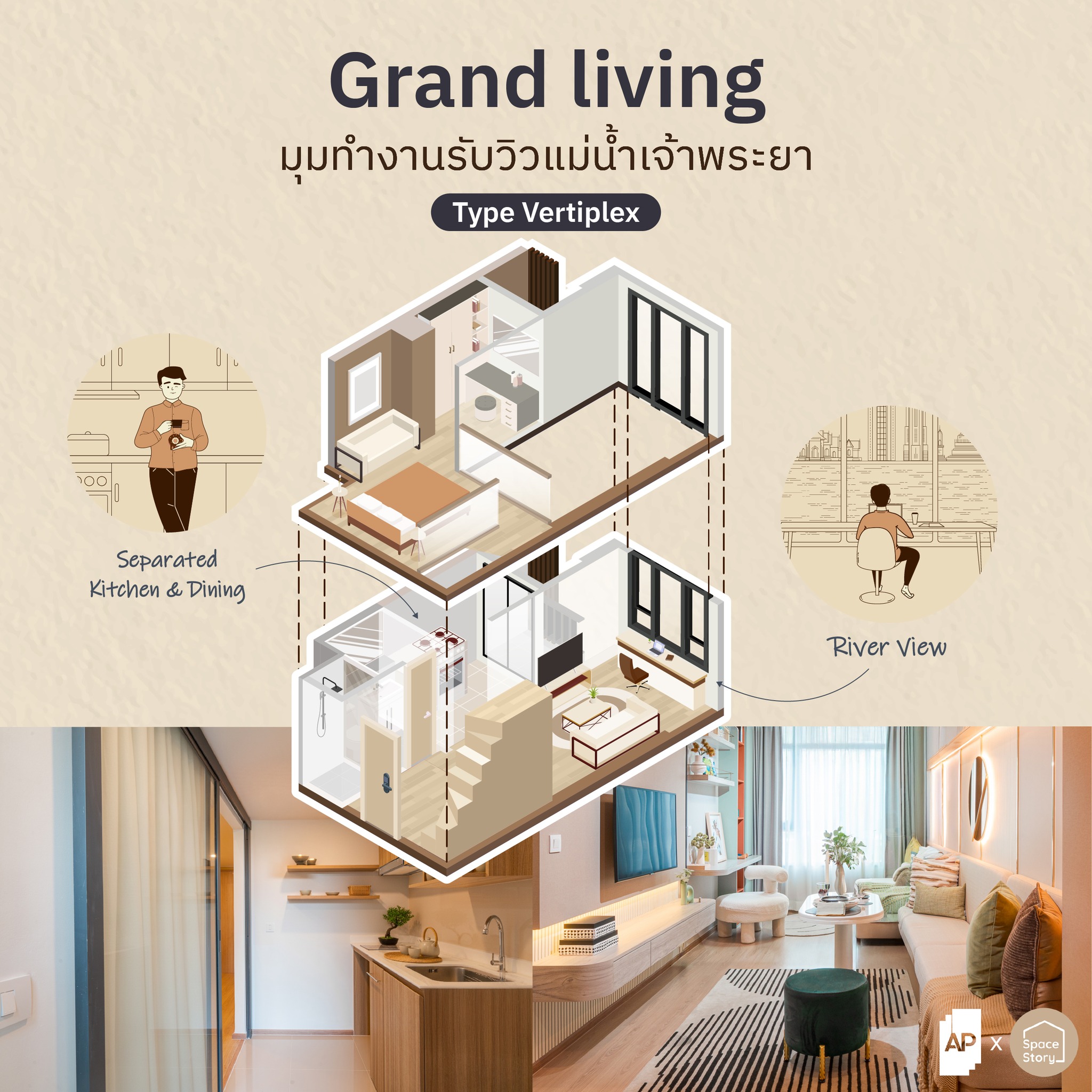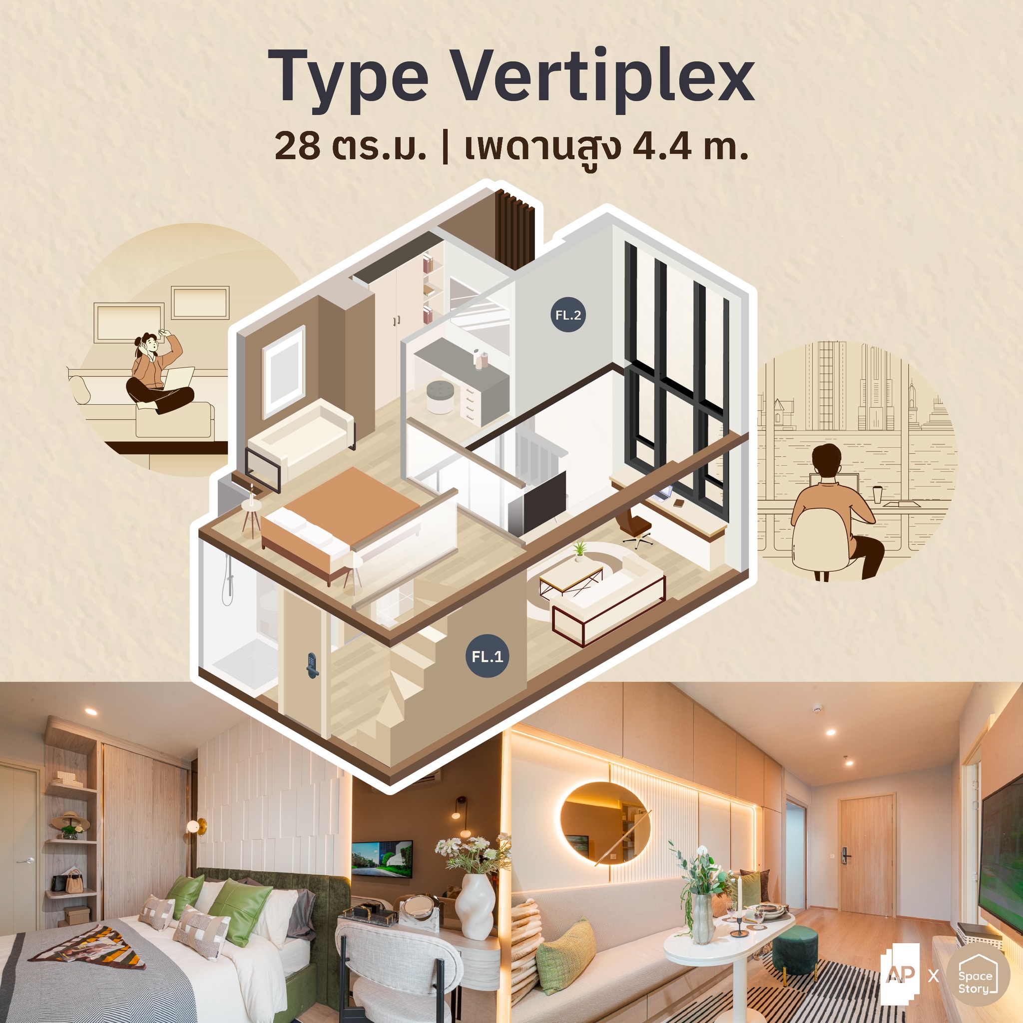 ห้องไฮไลต์ของโครงการนี้ คือห้อง Vertiplex 28 ตร.ม. ชั้น top floor กับมุม top view ที่มาพร้อมเพดานสูงแบบ Double Volume ถึง 4.4 เมตร ให้ความรู้สึกโปร่งโล่ง มีฟังก์ชัน Grand Living ที่เชื่อมต่อกับครัวปิดอย่างเป็นสัดส่วน ชั้นบนเป็นห้องนอนขนาดใหญ่ พร้อม Walk-in Closet