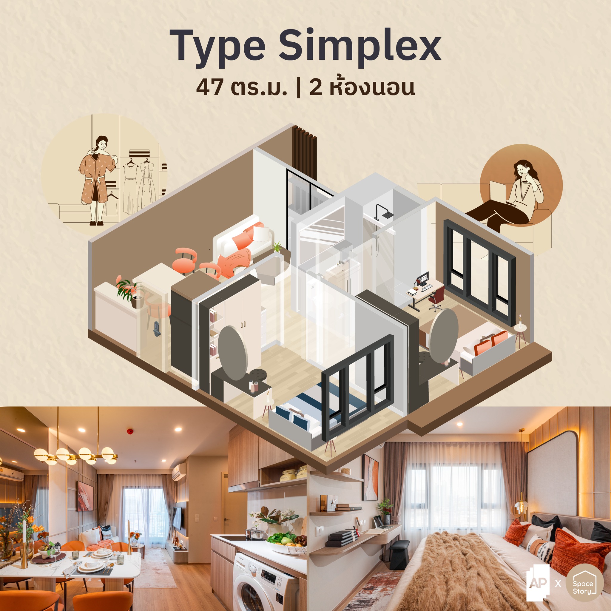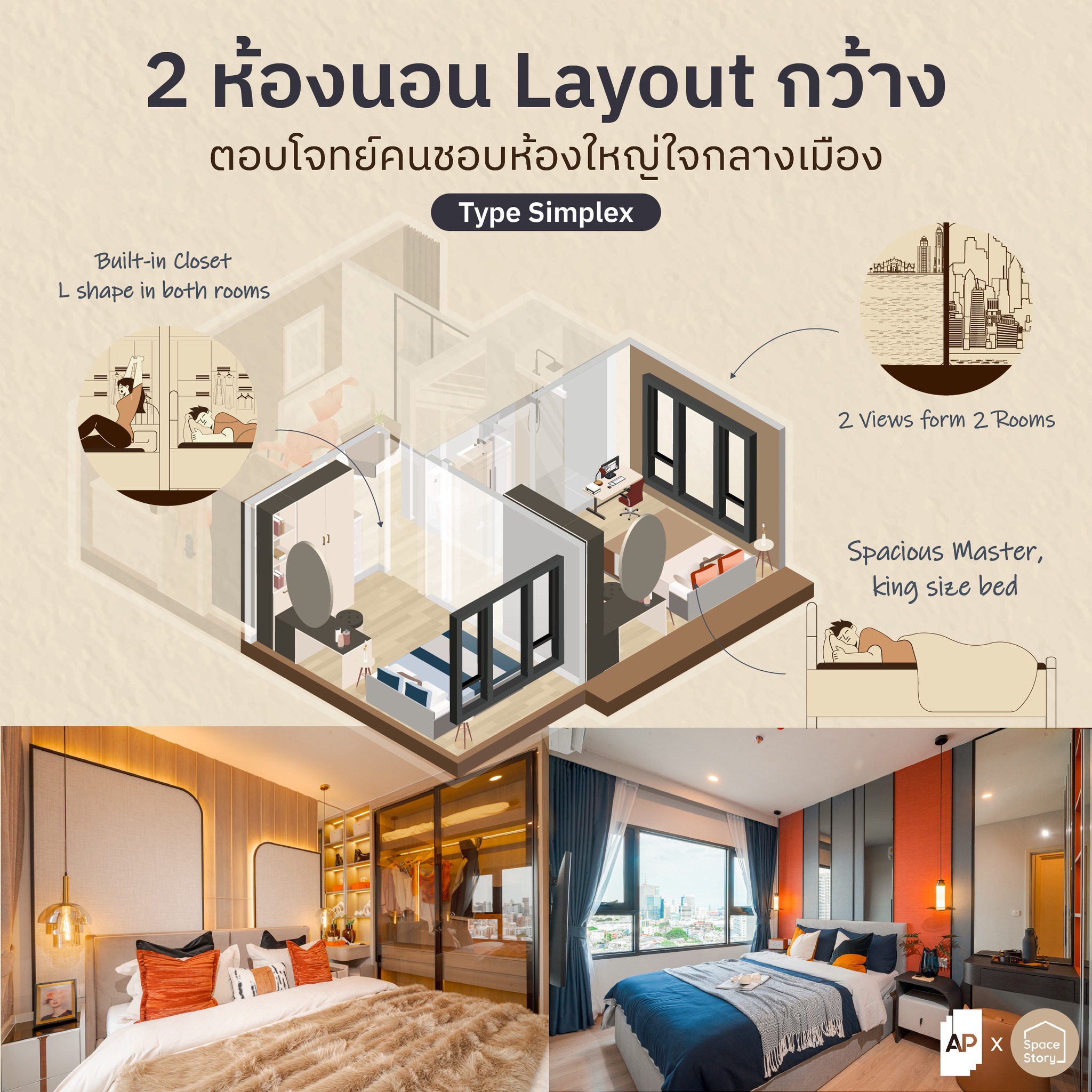 อีกห้องที่ตอบโจทย์คือ Simplex 2 ห้องนอน 47 ตร.ม. ที่เน้นความกว้างขวาง ครบครันการใช้งาน โซน Living เชื่อมต่อกับครัวและพื้นที่ทานข้าว พร้อมระเบียงที่ช่วยให้ห้องระบายอากาศได้ดี ห้องนอนทั้ง 2 ห้องวางเตียง King Size ได้ และมีพื้นที่ Walk-in Closet แบบ L-Shape ทั้งสองห้อง