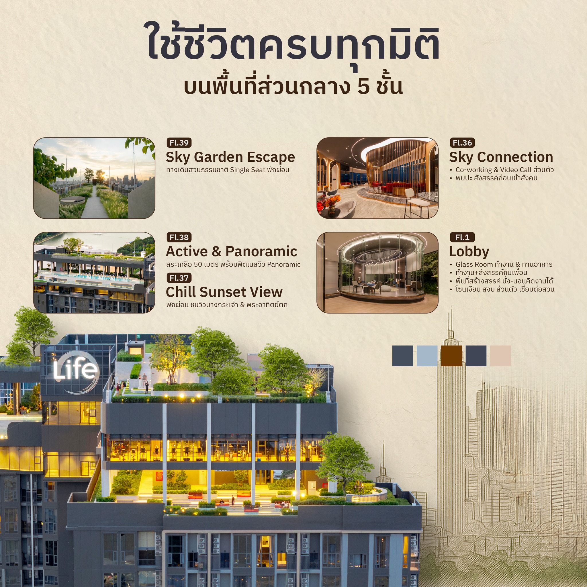ส่วนกลางทั้ง 5 ชั้น ถูกออกแบบมาให้เป็นพื้นที่พักใจของคนเมือง ตั้งแต่เช้าจรดค่ำ จากล็อบบี้ที่ต้อนรับสู่ Co-working Space สระว่ายน้ำและฟิตเนส ไปจนถึงสวนลอยฟ้าไว้ชมวิวกรุงเทพฯ