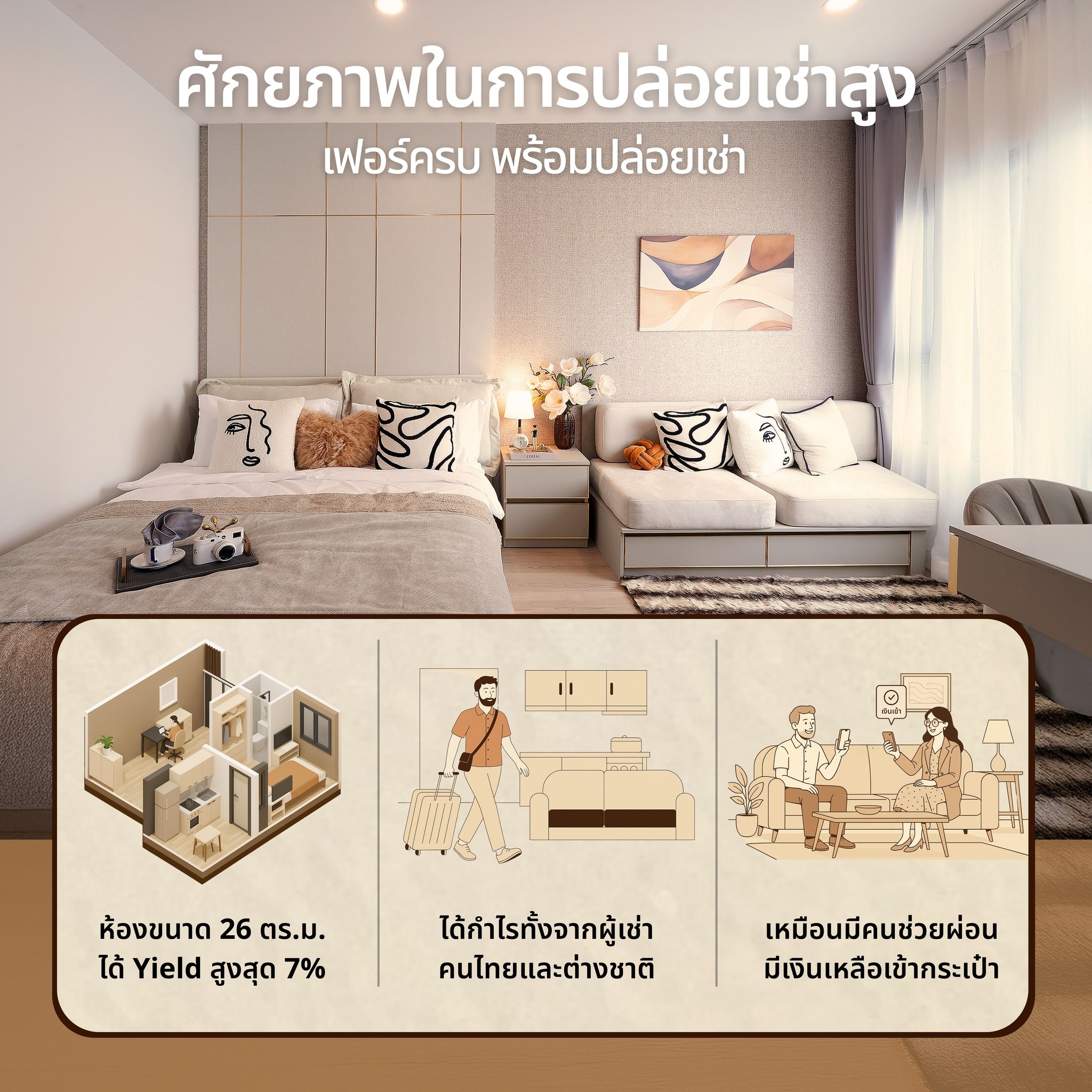 ในมุมของการลงทุน โครงการนี้มีศักยภาพในการปล่อยเช่าสูง เฟอร์ครบ พร้อมปล่อยเช่าได้ Yield สูงสุด 7% สำหรับห้องขนาด 26 ตร.ม. ได้กำไรทั้งจากผู้เช่าคนไทยและต่างชาติ เหมือนมีคนช่วยผ่อน และยังมีเงินเหลือเข้ากระเป๋า