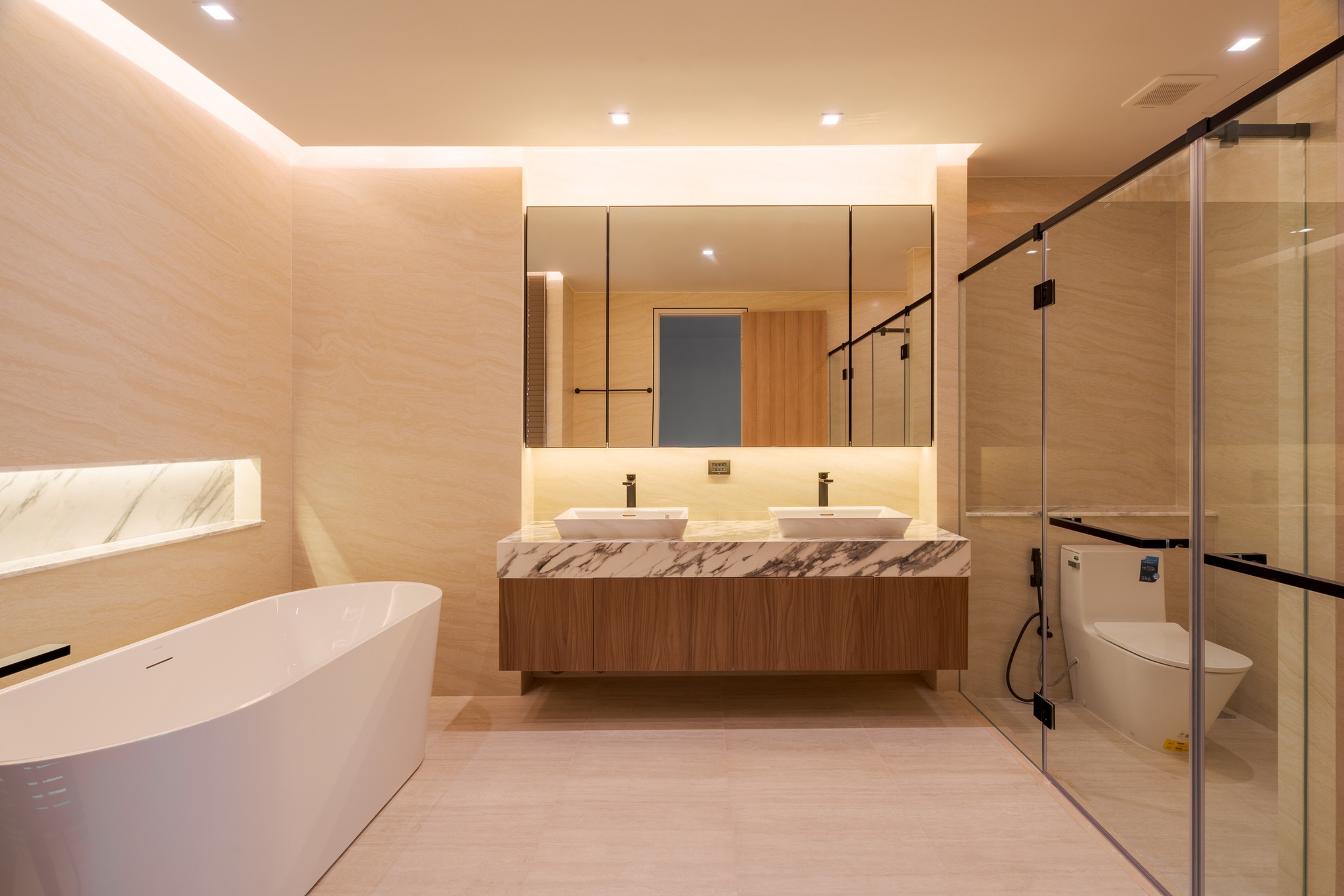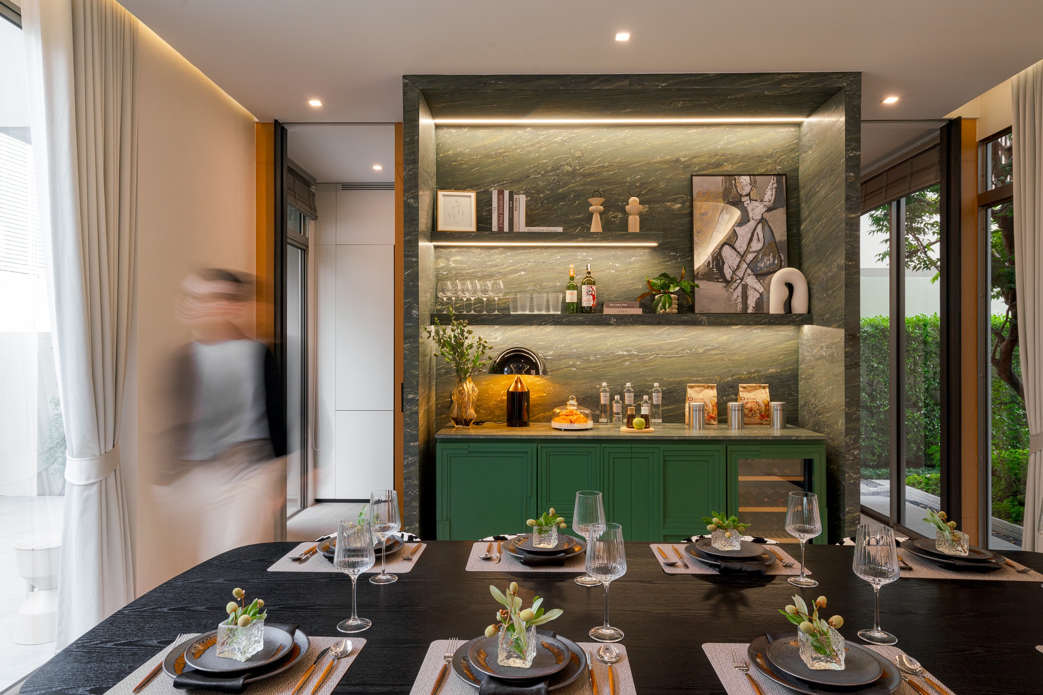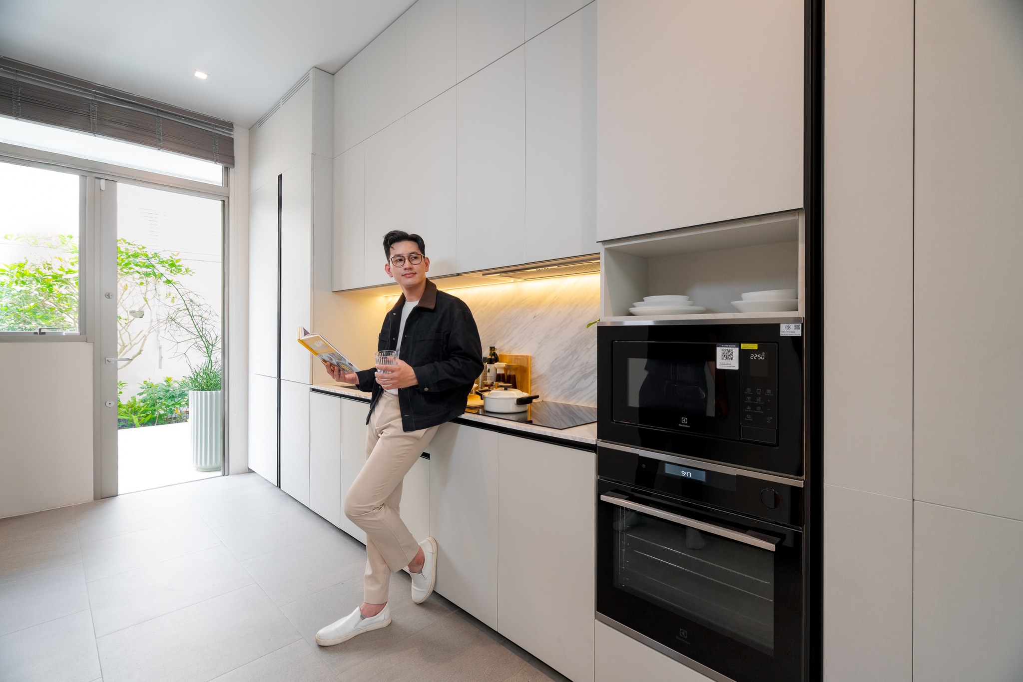 ดีไซน์ได้แรงบันดาลใจจาก Bauhaus เส้นสายเรขาคณิตที่ดูเรียบแต่ไม่จืด เท่แบบมั่นใจในตัวเอง ถ่ายทอดความงามของวัสดุได้อย่างเป็นธรรมขาติ เลือกมาดีทุกจุด พร้อมสะท้อนตัวตนของเจ้าของบ้านในแบบ “Defining Me” ตั้งแต่กรอบบานหน้าต่าง Tostem, สุขภัณฑ์ Kohler, ท็อปหินในครัว ไปจนถึงระบบความปลอดภัยจาก SECOM ทั้ง Digital Door Lock, CCTV แบบเดินสาย และ IP Camera